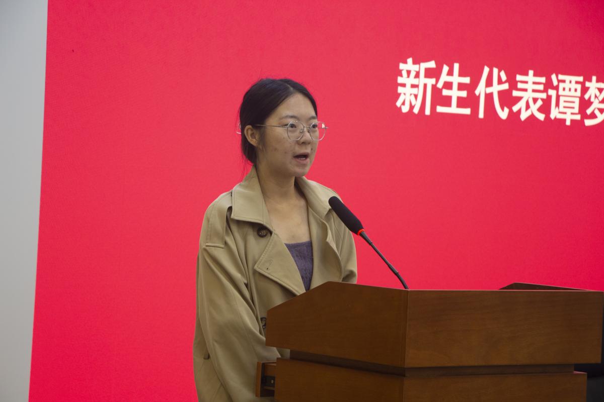 新生代表谭梦瑶以“初心、欢迎、期许”三个关键词娓娓道来,分享“顶天立地做学问,知行合一做学者,德法并举、修身立人”的个人感受。