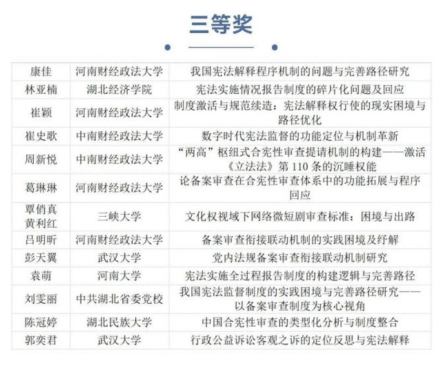 闭幕式上举行了青年学者优秀论文颁奖仪式。本次年会共收录各地高校员工投稿139篇,遴选出一、二、三等及优秀奖共计38篇获奖论文。我院法律硕士研究生林亚楠的论文《宪法实施情况报告制度的碎片化问题及回应》获得三等奖。